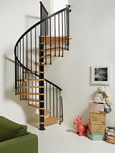 A basic spiral is constructed from welded steel with hardwood treads and a flat black finish.